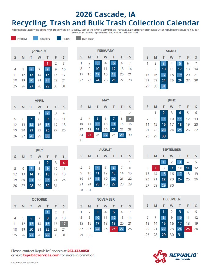 The City of Cascade provides citizens and businesses with curbside garbage and recycling collection. Garbage and recycling is collected Tuesdays on the West side of town and Thursdays on the east side of town. Recycling is every other week. There are no limits on the volume of recycling. Residential collection is limited to one 33-gallon (blue garbage cart) per household per week. Extra garbage requires a $2.00 bag tag available at City Hall, the grocery store, and convenience stores. Each household may dispose of one large (non appliance) item per month by calling City Hall by 3pm on the day prior to your regular garbage pick up. Recycling and garbage must be curbside by 7:00AM or it will not be picked up. Please click here for the City of Cascade Garbage & Recycle Guide: Garbage & Recycling Guide 2025 Printable Garbage & Recycle Calendar Please see below for the 2026 Recycle/Garbage Calendar: